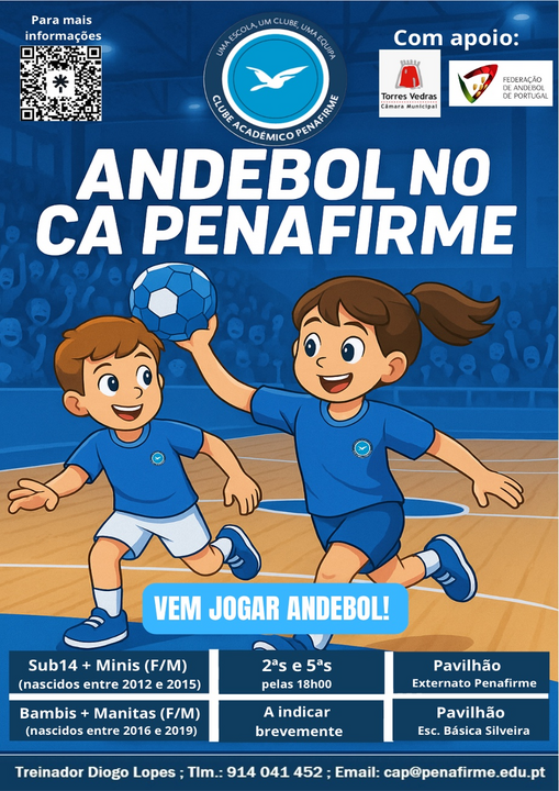 Este ano iremos dar a oportunidade de todos os jovens nascidos entre 2015 e 2012 — rapazes e raparigas — de experimentarem e se apaixonem por esta modalidade que tanto tem crescido em Portugal! O projeto de Andebol no CA Penafirme terá treinos a decorrer no Externato mais uma vez, todas as segundas e quintas-feiras pelas 18h.