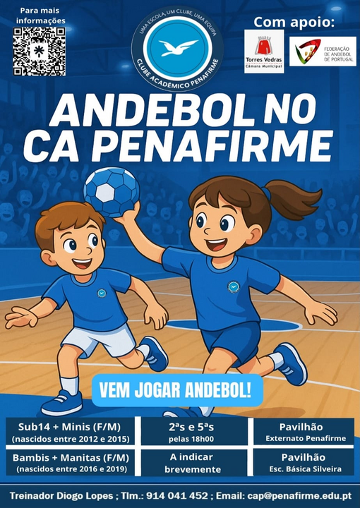 Este ano iremos dar a oportunidade de todos os jovens nascidos entre 2015 e 2012 — rapazes e raparigas — de experimentarem e se apaixonem por esta modalidade que tanto tem crescido em Portugal! O projeto de Andebol no CA Penafirme terá treinos a decorrer no Externato mais uma vez, todas as segundas e quintas-feiras pelas 18h.